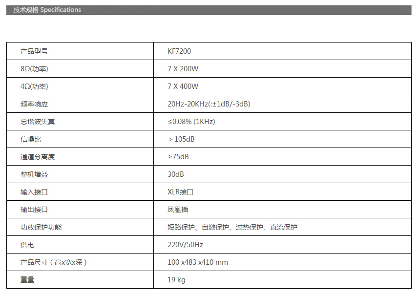 KF7200是一款7通道功率放大器。它采用全平衡、低失真、低噪聲、高速HI-FI型功放線路,音色通透,轉(zhuǎn)換速率快,可以達到高保真音質(zhì)要求。