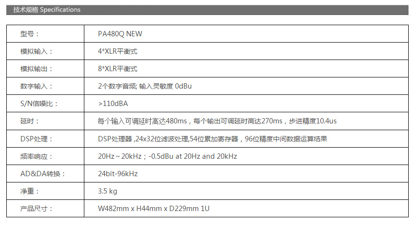特色:突出性能 24位*轉(zhuǎn)換器外加96kHz頻率, 具有卓越的音質(zhì)性能 4路輸入+8路輸出完美的混合矩陣音箱處理器。 *的DSP處理技術(shù),每個輸入通道都有30段參數(shù)均衡的濾波器。每個輸出通道都有11段參數(shù)均衡的濾波器 每個輸入和輸出濾波器可選擇為貝爾、雪弗、高/低通、帶通濾波、陷波濾波器和全通濾波器。 每個輸出通道都有一個精準(zhǔn)的動態(tài)范圍控制器,由一個根據(jù)壓限輸入的RMS值所運(yùn)行的壓限 每個輸入通道可調(diào)延遲時間高達(dá)480ms,每個輸出通道可調(diào)延時高達(dá)270ms。