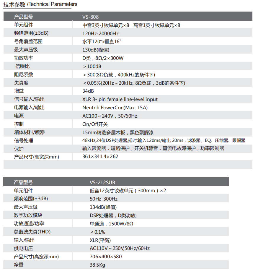 VS-808采用8個3″*率釹磁中音揚聲器和8個1″直接輻射釹磁高音揚聲器;